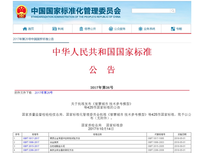 近日,中国国家标准化管理委员会发布关于批准发布《智慧城市技术参考模型》等425项国家标准的公告(2017年第26号),由我院全国工程材料标准化工作组(SAC/SWG3)主持制订的两项国家标准《金属基复合材料术语》(标准号GB/T 34558-2017)和《铝基复合材料冲击试验方法》(标准号GB/T 34556-2017)获批发布。加上2017年7月12日批准发布的国家标准《复合材料用腰果酚改性酚醛树脂》(标准号GB/T 34006-2017),2017年我院全国工程材料标准化工作组(SAC/SWG3)共计有三项国家标准获批发布。