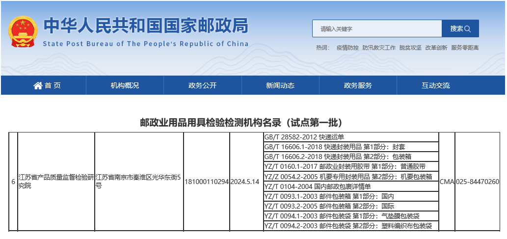 近日,国家邮政局官方网站公布全国18家首批邮政业用品用具检验检测机构名录,江苏省产品质量监督检验研究院成功入选成为江苏省唯一一家获批机构。