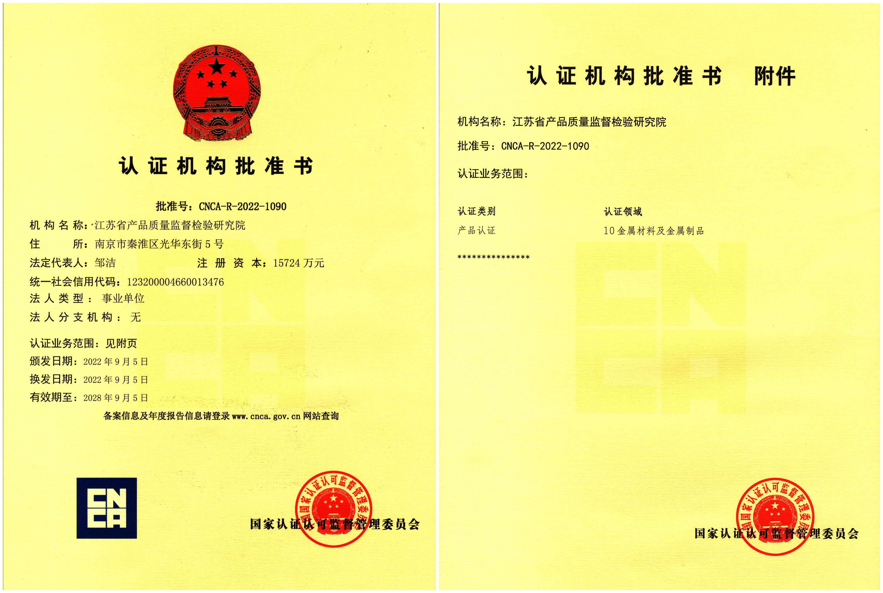 近日,省质检院获得了国家认证认可监督管理委员会(CNCA)颁发的认证机构批准书(批准号:CNCA-R-2022-1090),认证业务范围:金属材料及金属制品的产品认证领域。这标志着省质检院正式成为认证机构。