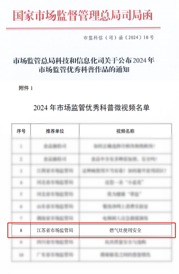 近日,国家市场监督管理总局科技和信息化司公布了2024年市场监管优秀科普作品名单,省质检院拍摄的科普视频“燃气灶使用安全”经专家审核后成功入选为十大2024年市场监管优秀科普微视频。