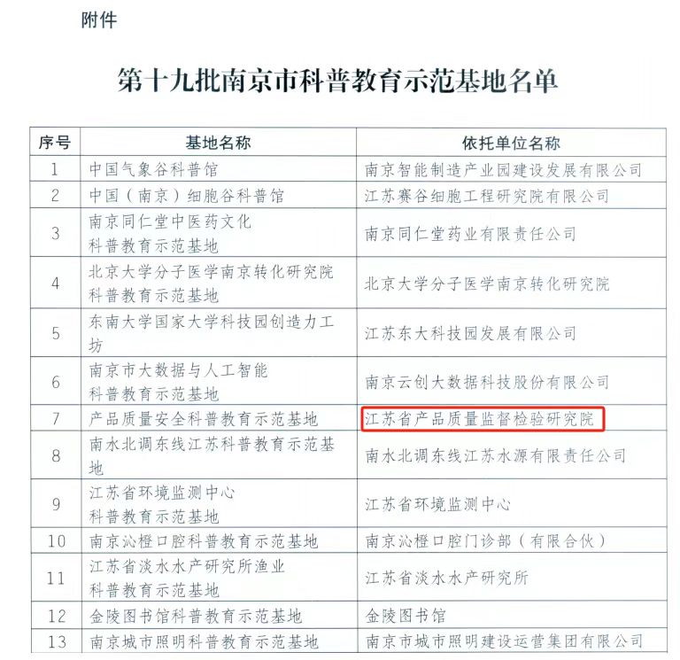 近日,省质检院申报的“产品质量安全科普教育示范基地”从多个候选基地中脱颖而出,被认定为南京市科普教育示范基地,并予以授牌。