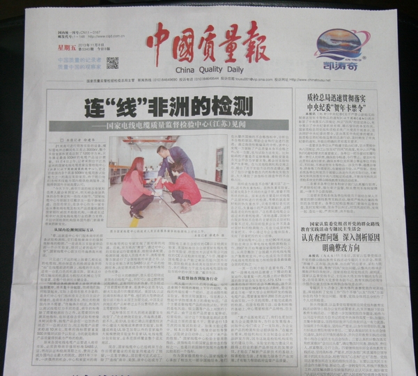 11月8日,《中国质量报》第5340期今日头版头条刊登了题为《连“线”非洲的检测——国家电线电缆质量监督检验中心(江苏)见闻》的专题报道,详细介绍了我院宜兴国家线缆中心开展国际互认、积极服务政府和企业的做法,对中心强化能力建设、推动产业发展予以了充分肯定。